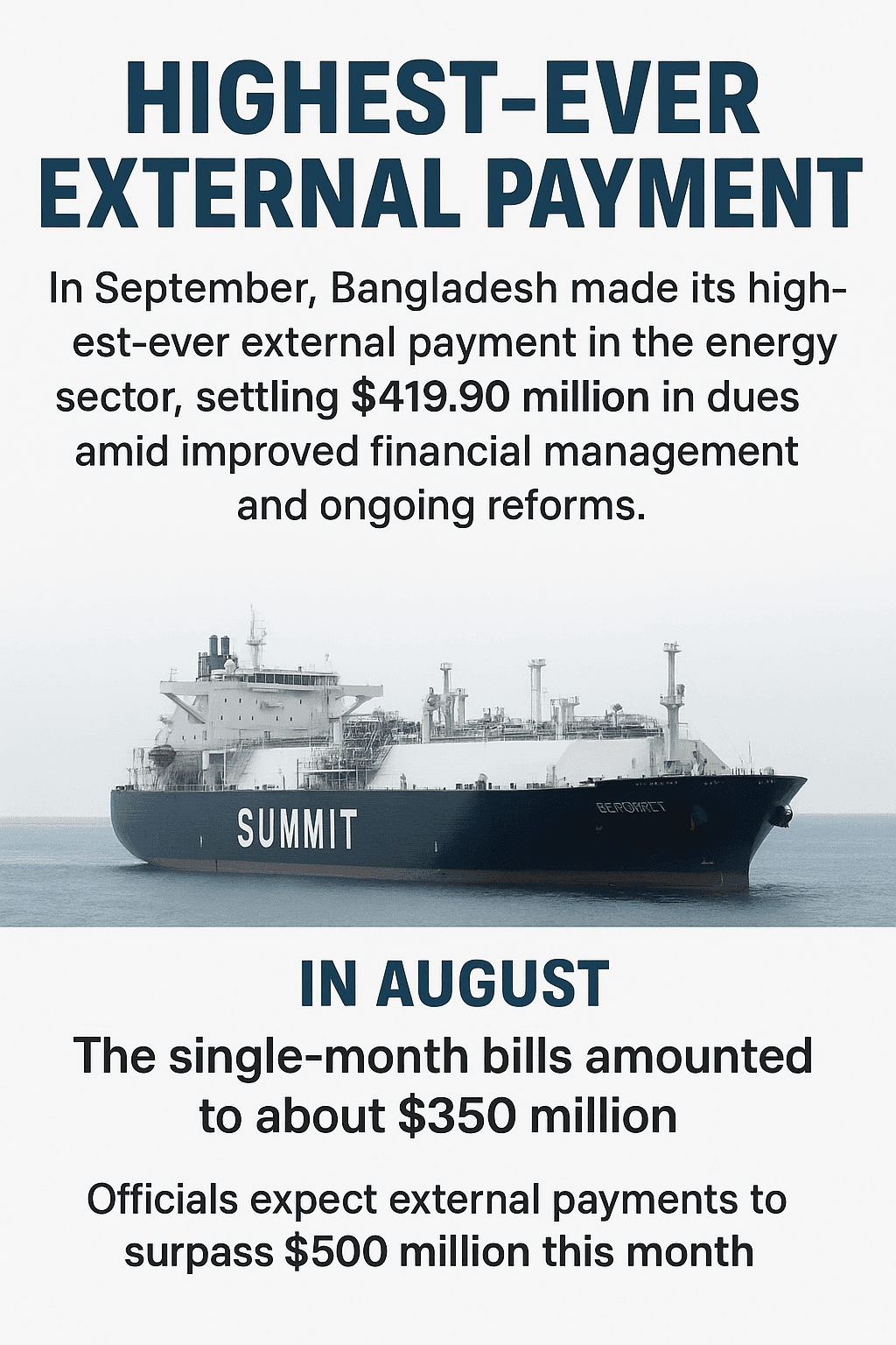In September, Bangladesh made its highest-ever external payment in the energy sector, settling $419.90 million in dues amid what officials describe as improved financial management and ongoing reforms.