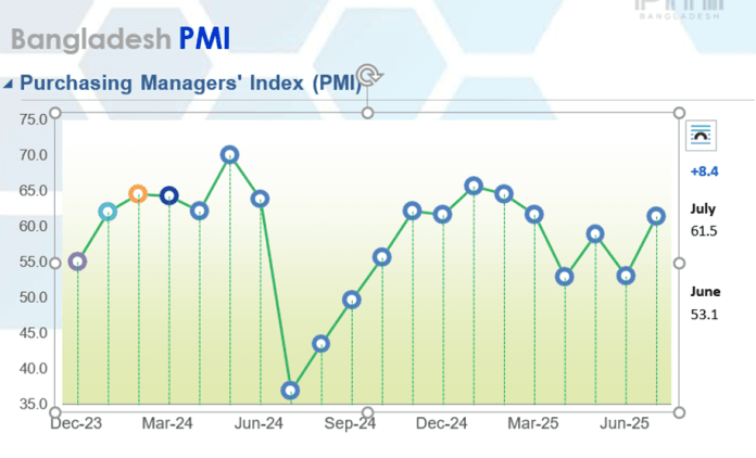 Bangladesh’s economic activity accelerated in July, with the Purchasing Managers’ Index (PMI) climbing to 61.5 — an 8.4-point increase from the previous month — signaling robust growth across key sectors, according to the latest report from the Metropolitan Chamber of Commerce and Industry (MCCI).