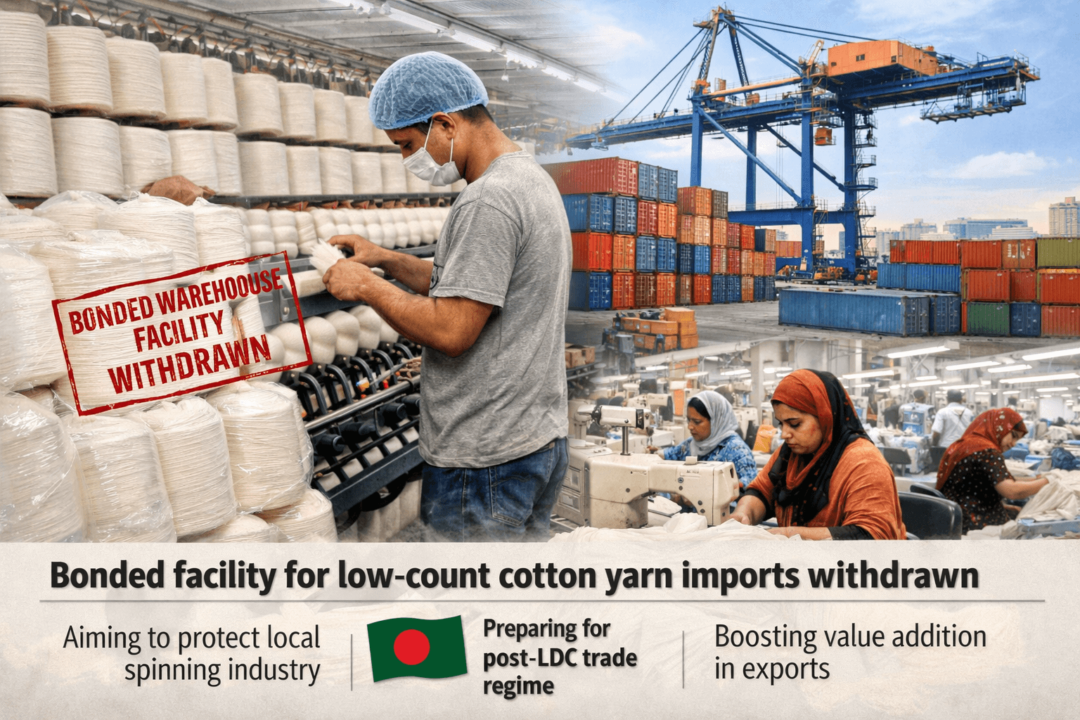 The government has withdrawn the bonded warehouse facility for the import of 10 to 30 count cotton yarn used in export-oriented readymade garment factories, aiming to protect the domestic spinning industry and increase value addition in exports ahead of Bangladesh’s graduation from least developed country (LDC) status.