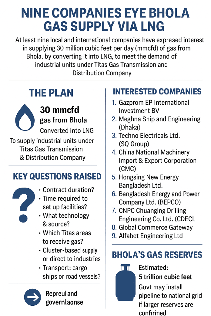 At least nine local and international companies have expressed interest in supplying 30 million cubic feet per day (mmcfd) of gas from Bhola – by converting it into LNG – for industries under Titas Gas Transmission and Distribution Company.