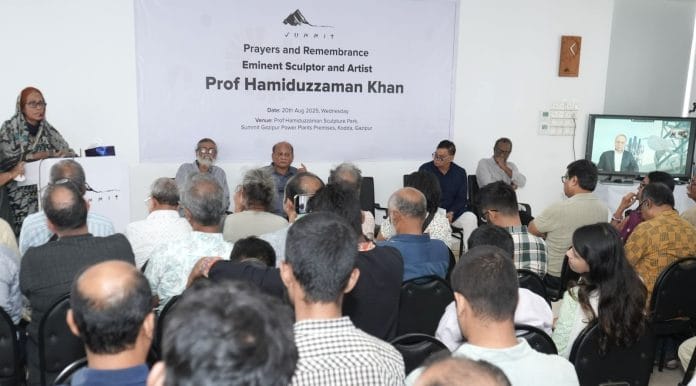 Professor Hamiduzzaman Khan, Bangladesh’s eminent sculptor and artist, who passed away on 20 July 2025, was remembered at a special ceremony held on Wednesday at the Hamiduzzaman Sculpture Park inside the Summit Gazipur 464 MW Power Plant premises in Kodda, Gazipur.
