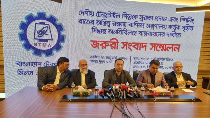 The decision was announced at an emergency press conference held at the association’s office in Karwan Bazar, Dhaka, on Wednesday (22 January). BTMA said the shutdown was unavoidable unless the government immediately implements a commerce ministry decision aimed at safeguarding the local textile industry and ensuring the survival of the spinning sector.